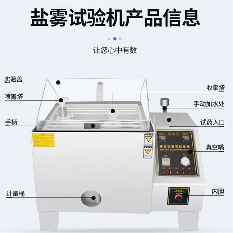 鹽霧箱容積不小于012m3、不小于014m3、箱內溫度35℃±2℃、噴霧壓力70~170kPa、鹽霧收集器至少兩個、收集面積各80cm2.被試面與垂直方向成15~30°讓鹽霧自由沉降在被測面上、不能直接噴射、試驗支架用玻璃、塑料制造、試件不能相互接觸、互相滴液;箱內溫度35℃±2℃、每個收集器收集溶液.