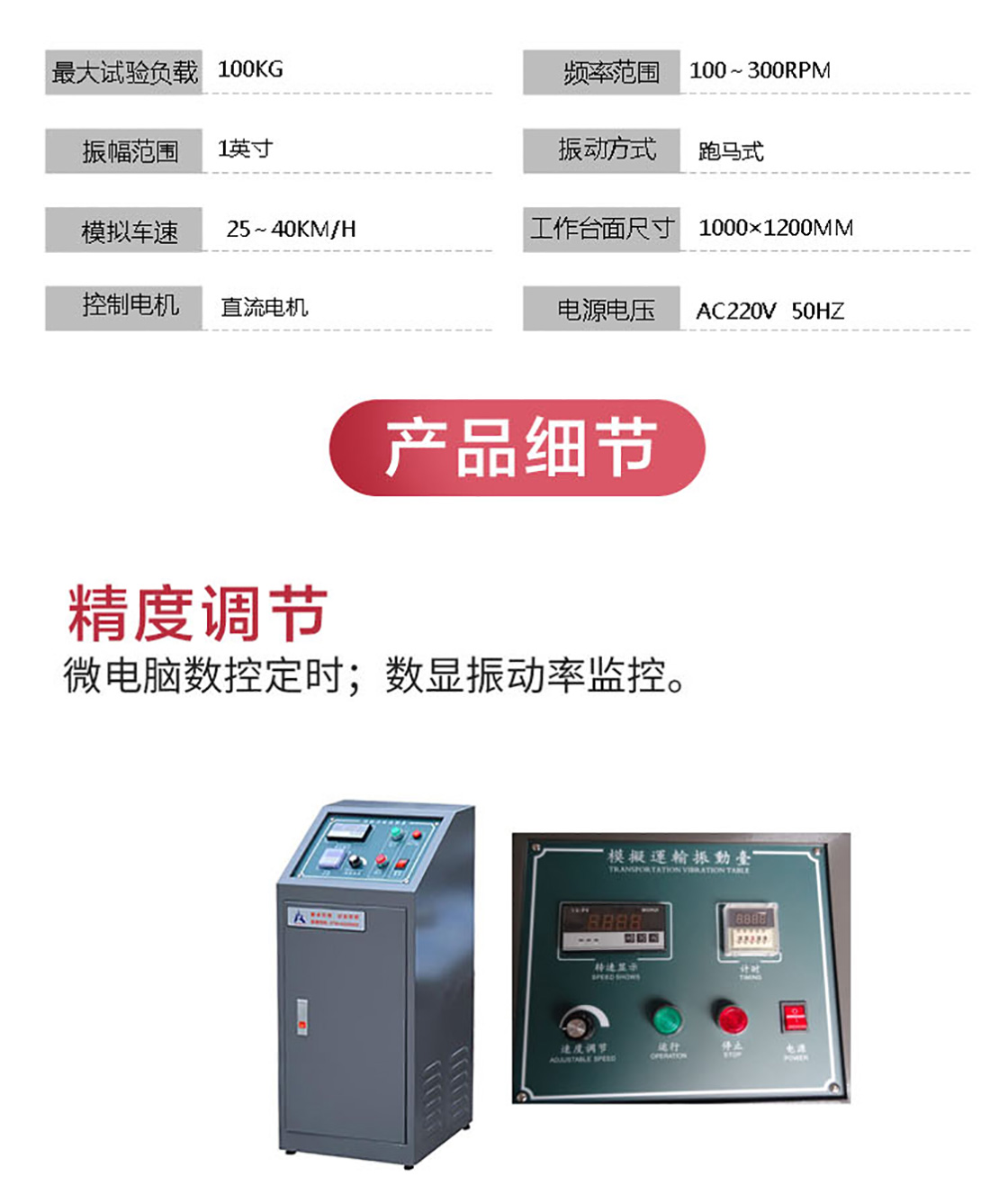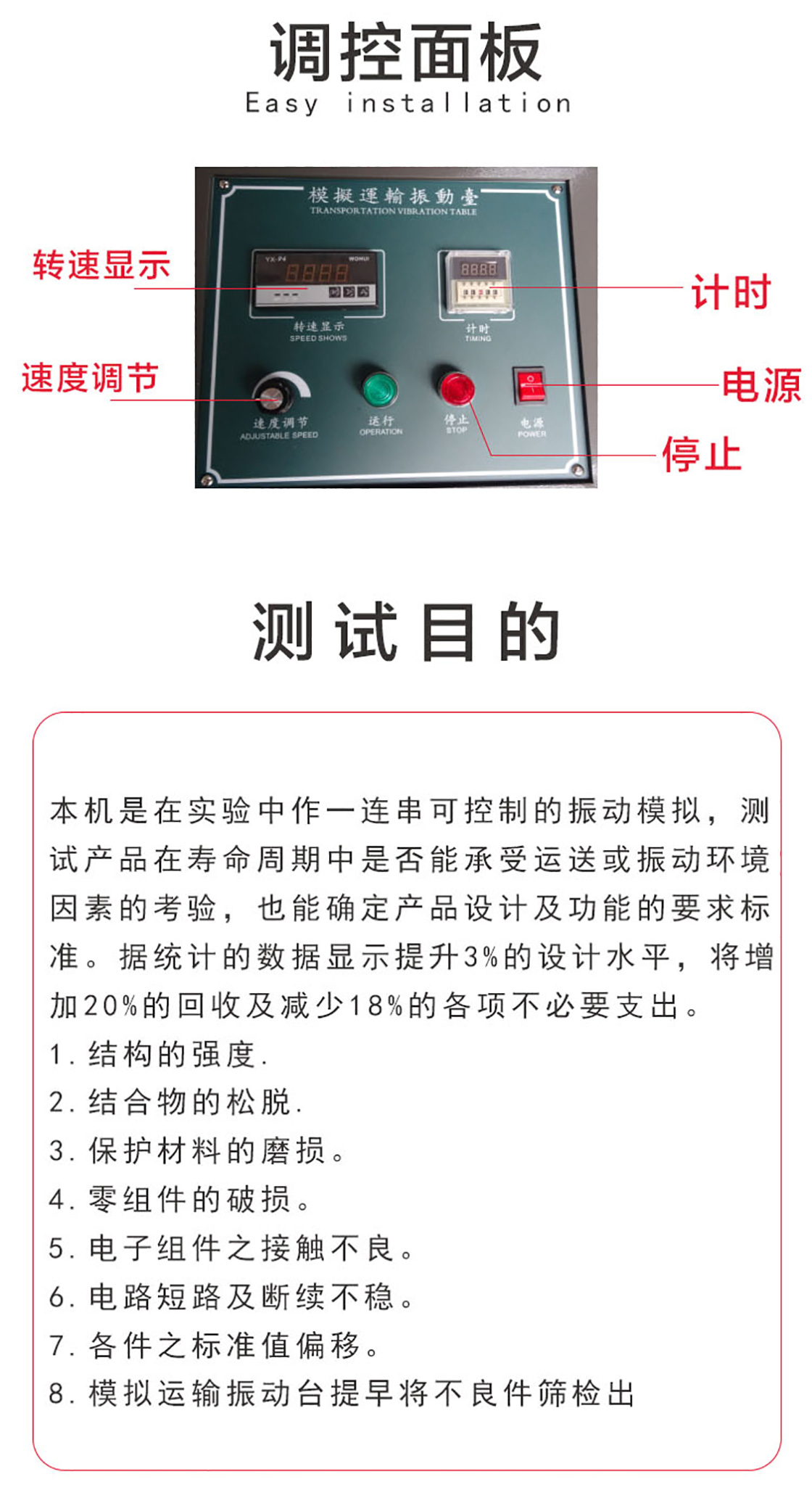 模擬運輸振動臺也稱"振動臺",模擬汽車運輸途中的顛簸對產品造成的破壞,用以鑒定產品是否忍受環境振動的能力,適用于電子、機電、光電、汽機車、玩具……等各行各業的研究、開發、品管、制造。是您提高產品質量可靠性不可多得的試驗機。