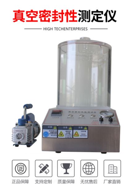 測試原理:通過對真空室抽真空,使浸在水中的試樣產生內外壓差,觀測試樣內氣體外逸情況,以此判定試樣的密封性能;通過對真空室抽真空,使試樣產生內外壓差,觀測試樣膨脹及釋放真空后試樣形狀恢復情況,以此判定試樣的密封性能。